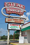 This Steak Burger sign is probably from the 1950s. The panels originally advertised for Texas Tom's. In 2021, the letters were removed from the sign and replaced with plastic letters for Carmen's Cantina. For more, see these websites: 1 and 2. [map]
