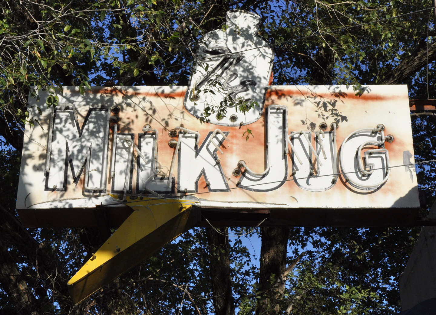 The Milk Jug was a grocery store with two other locations in Independence. This sign is probably from the 1950s. I don't know if the other stores had signs like this. The building has been vacant since at least 2007. [map]