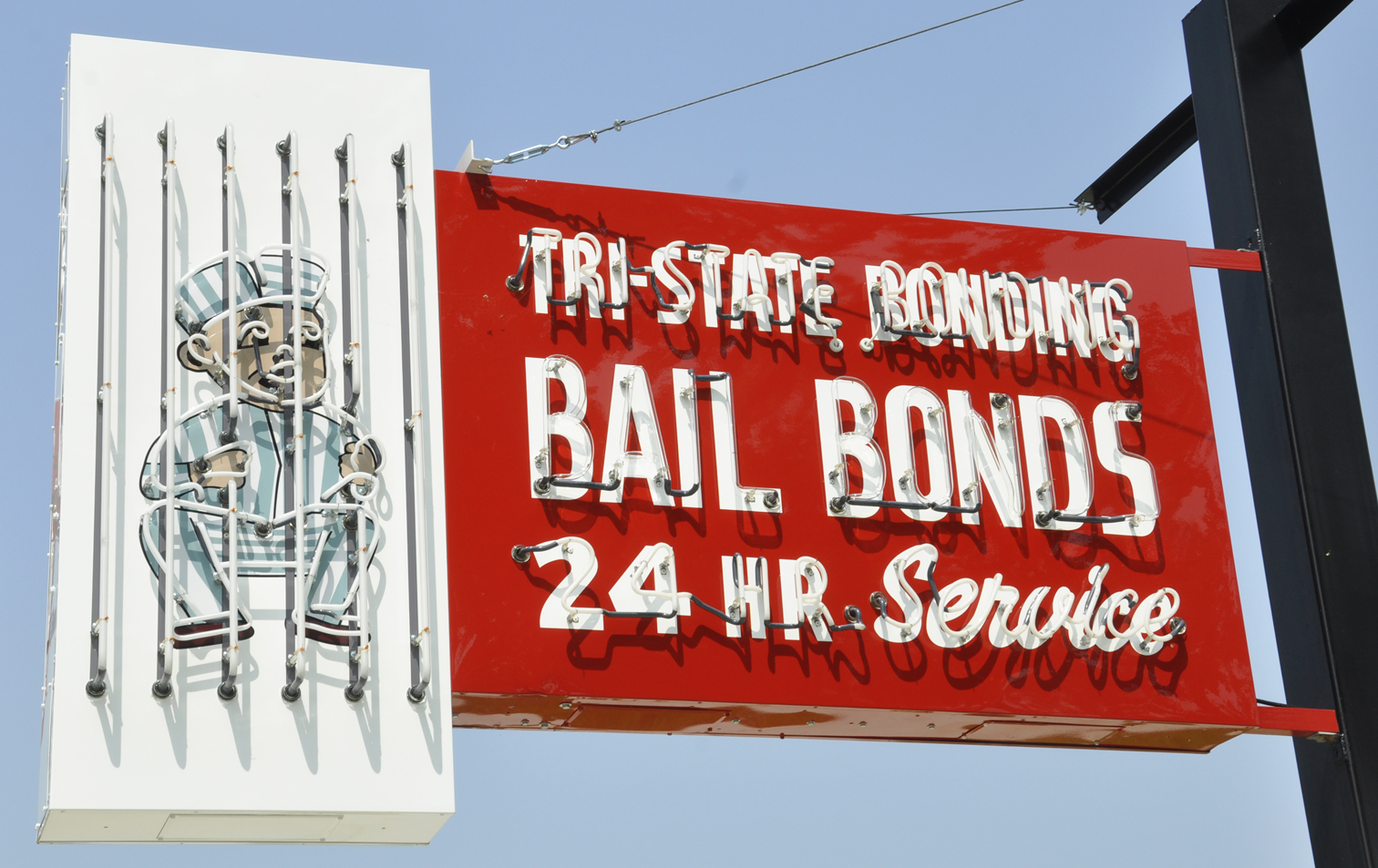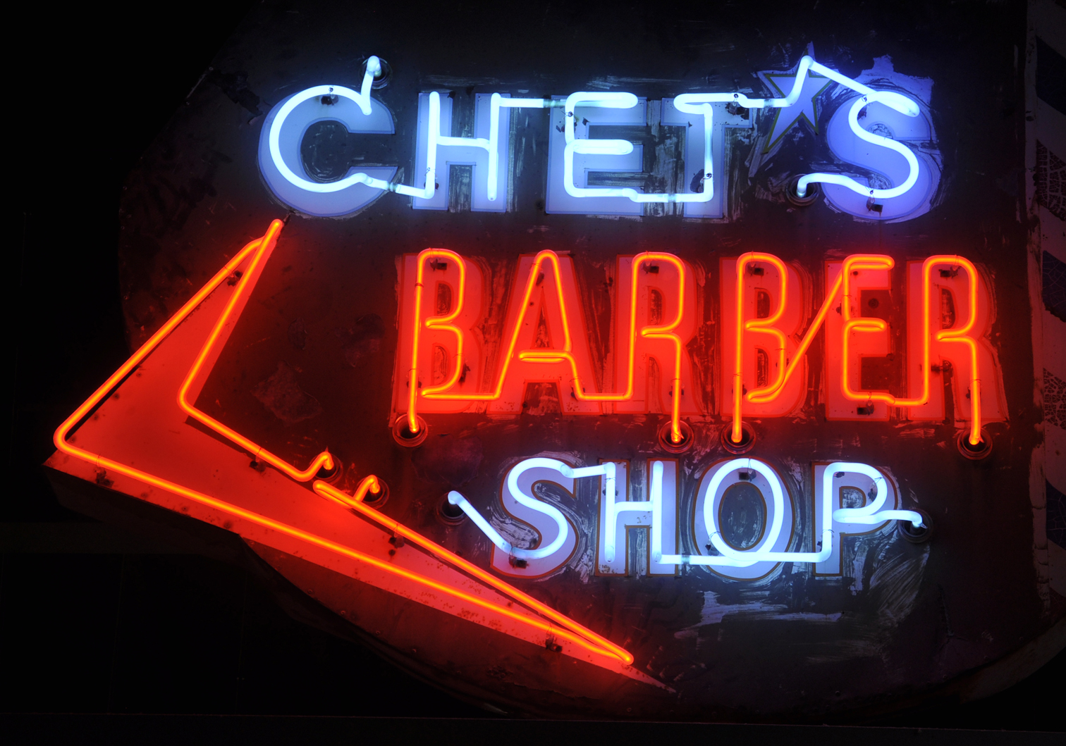 Don Bisig's Barber Shop opened in 1962. Around 2018, the business closed and the sign was removed. In 2020, the sign was adapted for the Gentleman's Chair Barber Shop and reinstalled. For more, see this website. [map] |
