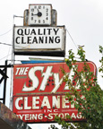 The Style Cleaners' neon sign was probably from the 1950s. The clock and plastic panels were probably from the 1960s. This photo is from 2010. By 2014, the store had closed and the sign was gone.
