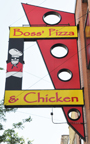 | White Banner Uniform opened in 1961 and this sign was installed then. The business moved in 2017. In 2022, the sign was adapted for Boss' Pizza & Chicken. [map] |