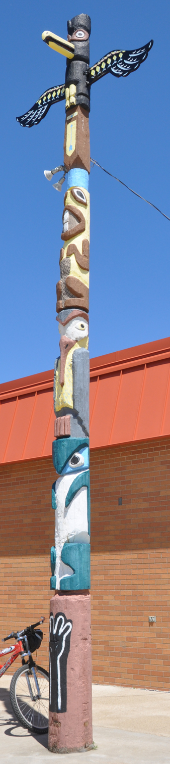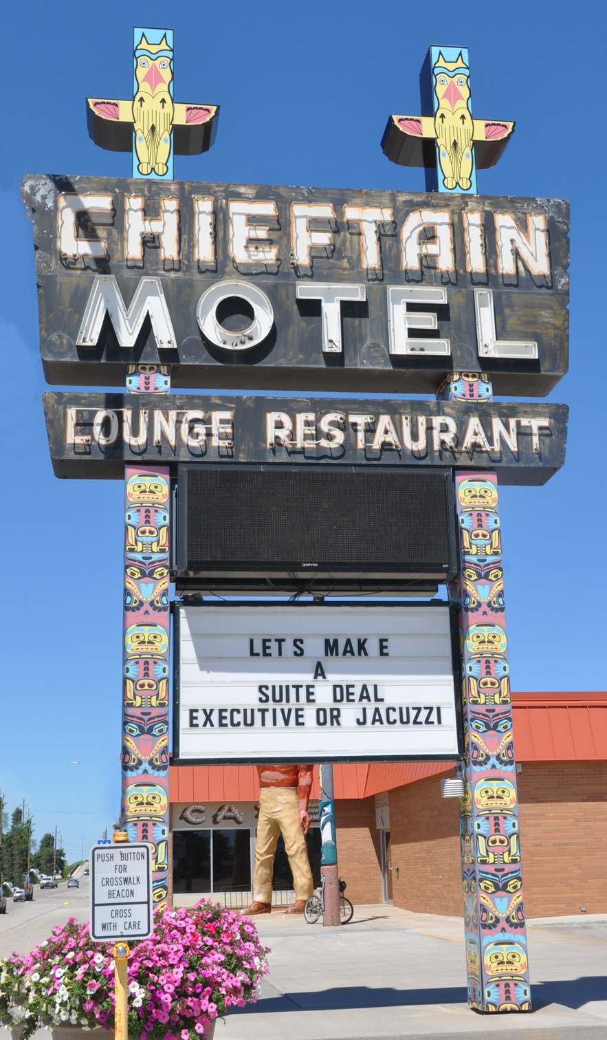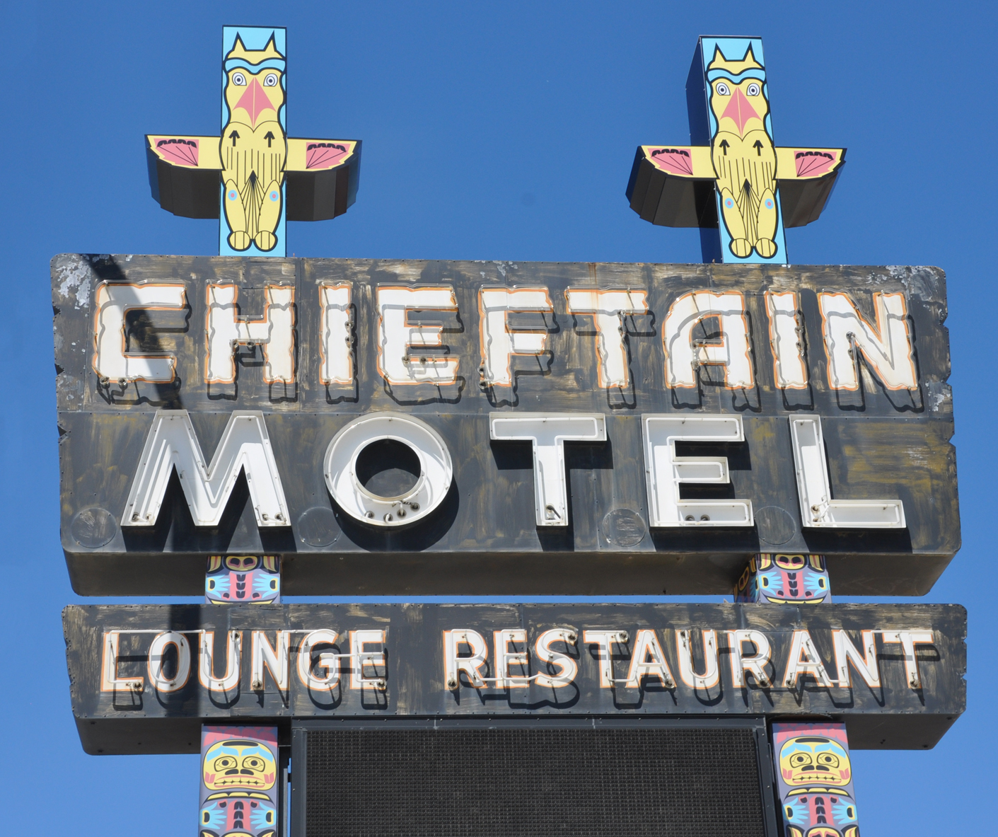 | The Chieftain Motel motel opened in 1964 and this sign appears to be from then. The original totem pole panels were replaced at some point. It also went by the name Chieftain Motor Lodge. The building now houses the Chieftain Conference Center. In addition to this sign and the totem poles, there is also a fiberglass Indian statue here. For more, see this website. [map] |
