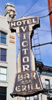 The sign at Mom's Diner, formerly Mom's Peppermill Restaurant, used to be animated. The crank of the peppermill would turn and the lights blinked out ground pepper. The decaying sign was repainted yellow as part of a major 2003 restaurant makeover when it became Chef Giorgio's Mom's Diner. Although the neon was not restored, the crank and upper piece with "Exit" and "8" were repaired and spinning again. The restaurant closed around 2007. It was demolished around 2023 but the sign is still there. [map] The Clam Broth House restaurant opened in 1899. The name came from the broth, served free of charge, that was made from the water used to boil the steamed clams. The restaurant closed in 2003 when structural damage was discovered. The building was demolished in 2004. There were originally three of these pointing hand signs. One was located outside the restaurant, pointing downwards towards the entrance. That giant yellow sign is reportedly in storage. There was also a smaller one directly above the entrance, pointing inward toward the building. The third one, located across the street and shown above, is the only one that remains on display. In 2010, a new Clam Broth House restaurant opened. For more, see these websites: 1 and 2. [map] I believe the Hotel Victor was built in 1916. This sign was built in 1935. The building is no longer used as a hotel. The sign was removed around 2020. |