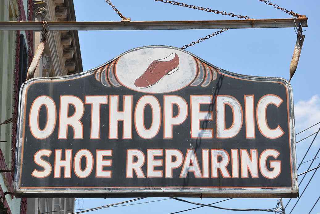 The Orthopedic Shoe Repair sign appeared to be pre-1950s. The store and sign were gone by 2021. |