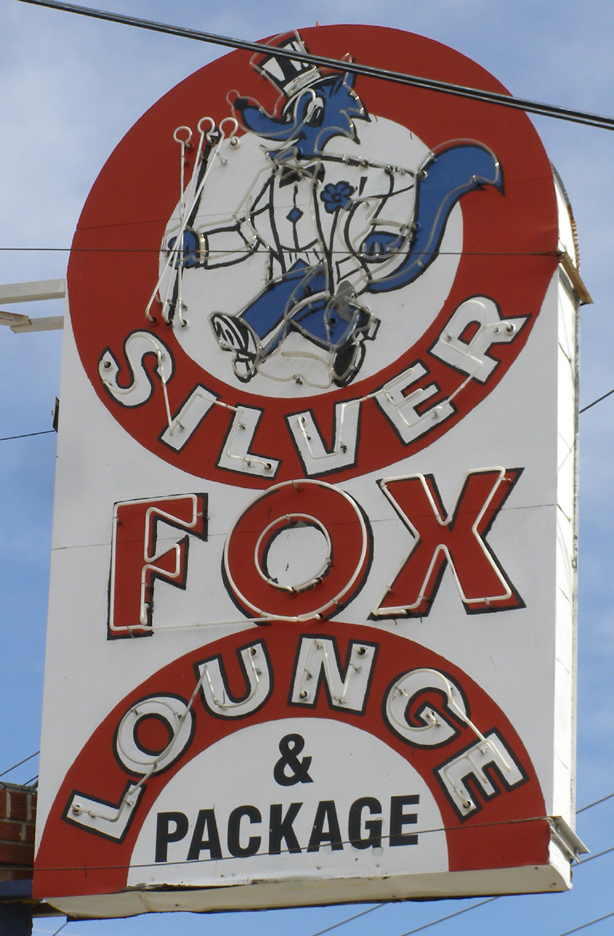 The Zia Motor Lodge was built around 1938 as the Zia Lodge. By 1961, a smaller zia symbol sign was replaced with this one. The sign panel came from the Sentry Hiway House motel and was reworked for the Zia Lodge. The starburst at the top of the sign flashed at night. The motel was demolished in 2005 but this sign remains on the vacant lot. For more, see this website. [map] The Silver Fox Lounge closed in 2009 and the sign was removed. For more, see these websites: 1 and 2. |