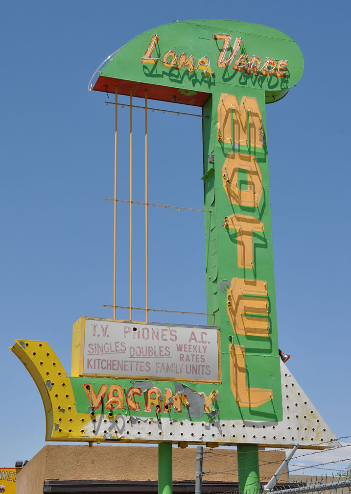 | The Loma Verde Motel was built in 1950 as the Loma Verde Court. In the early 1960s, it became the Loma Verde Motel and this sign was built. By 2021, most of the neon had been removed and the sign had been painted over. By 2025, the sign had been restored and neon was added. The arrow no longer has bulbs and "Loma Verde" is now upper and lower case. While the original sign had two bare vertical poles connecting the upper and lower panels, a grid was added with a neon ocotillo plant growing out of a new panel depicting sand. For more, see this website. [map] |