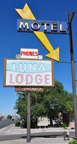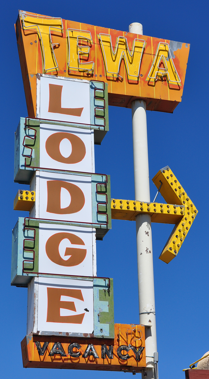 | The Tewa Lodge was built in 1946. This sign is probably from the 1960s. In 2025, the sign was restored. For more, see these websites: 1, 2, and 3. [map] |