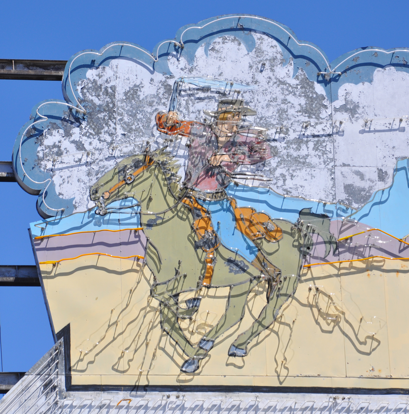 | Keshmiri's Pony Express Lodge opened around 1933 as Cremer's Auto Court. In 1951, it became an annex of Harold's Club and was renamed the Pony Express Motel. This animated, single-sided sign was built then. It was installed across the street from the motel, hence, the approximately 35-foot-long arrow. The sign was designed by Frank N. Stricklan and produced by Cosgriff Neon. The sign originally read "Harold's Pony Express Motel." The name "Harold's" was replaced with "Keshmiri's" around 1989 when the motel was sold to Joe Keshmiri. The other text on the sign is composed of open channel letters. Channel letters were used for two reasons. The surrounding metal border protected the neon tubing from vandalism and weather. In addition, the neon letters were defined. Most vintage signs from the 1940s and 1950s have the neon installed directly on the panels. When the signs are lit, the glow of the tubing is reflected onto the panels. The Pony Express sign is no longer lit. It had red, gold, blue, white, and green neon. The horses' legs and the Indian's arrows were sequentially lit. The sign is not landmarked in any way and there are no plans to restore it. For more, see this website. [map] |