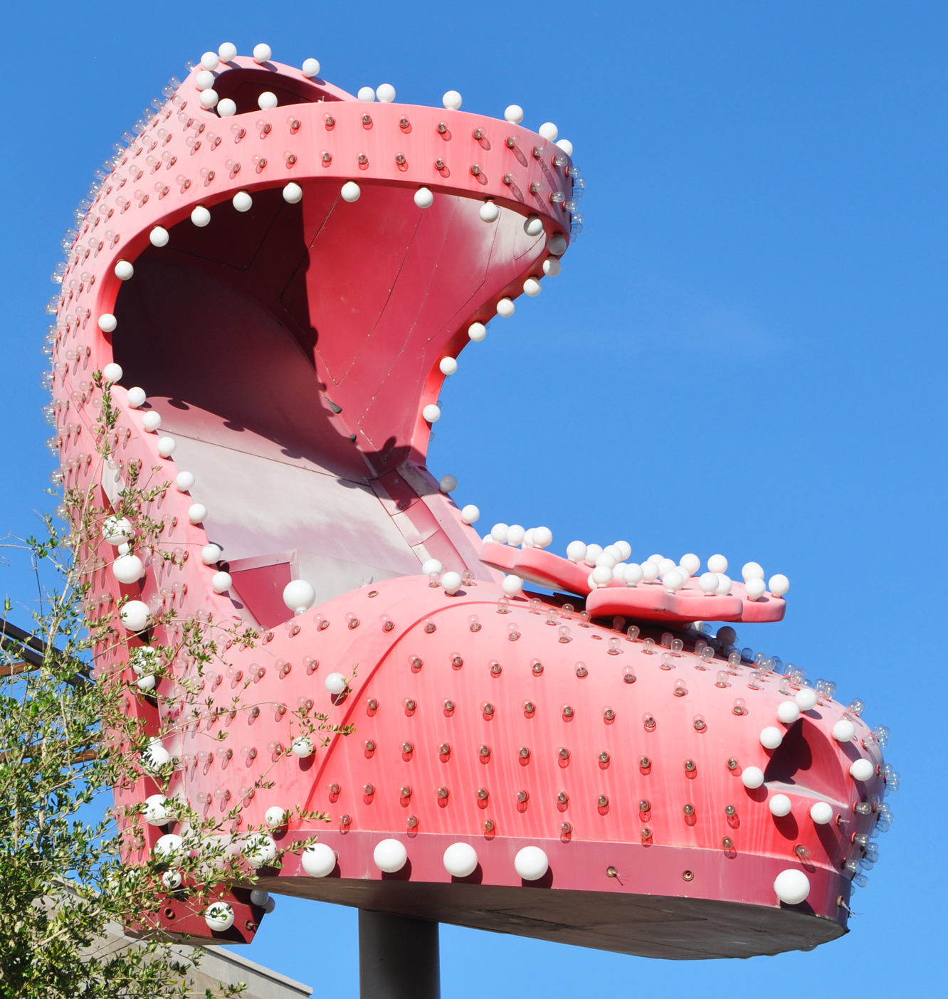 The Silver Slipper casino opened in 1950 and closed in 1988. This 12-foot-tall shoe was designed by YESCO and installed on top of the casino in the 1960s. It has more than 900 bulbs. It was later moved to the top of the Silver Slipper sign. The signs were saved by The Neon Museum. In 2009, the slipper was restored and installed in the median near the museum. For more, see these websites: 1 and 2. [map]
