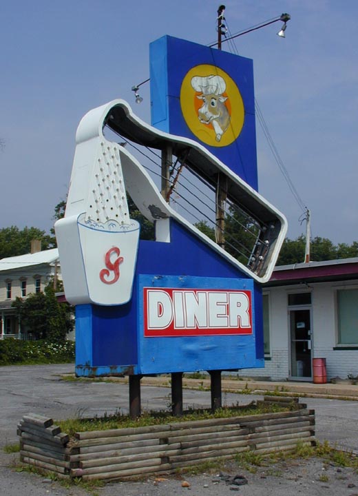| The Gatesdale Dairy Bar opened in 1941 with this flashing milk bottle sign. Originally, "Gatesdale" was painted in script on the bottle. The restaurant later become the Gatesdale Diner. In 2006, the restaurant closed and the building was taken over by Dominick's Italian Bistro. The sign was repainted to represent a wine bottle pouring into a glass. By 2011, Dominick's was closed but the sign was still there. By 2015, the sign was gone. For more, see this website. |