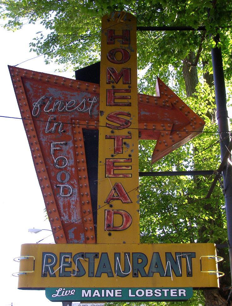 | The Spot Restaurant and the Old Homestead Restaurant were next-door neighbors. Both of them have been replaced with other businesses but the signs have been allowed to stay. [map] |