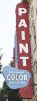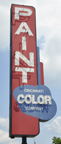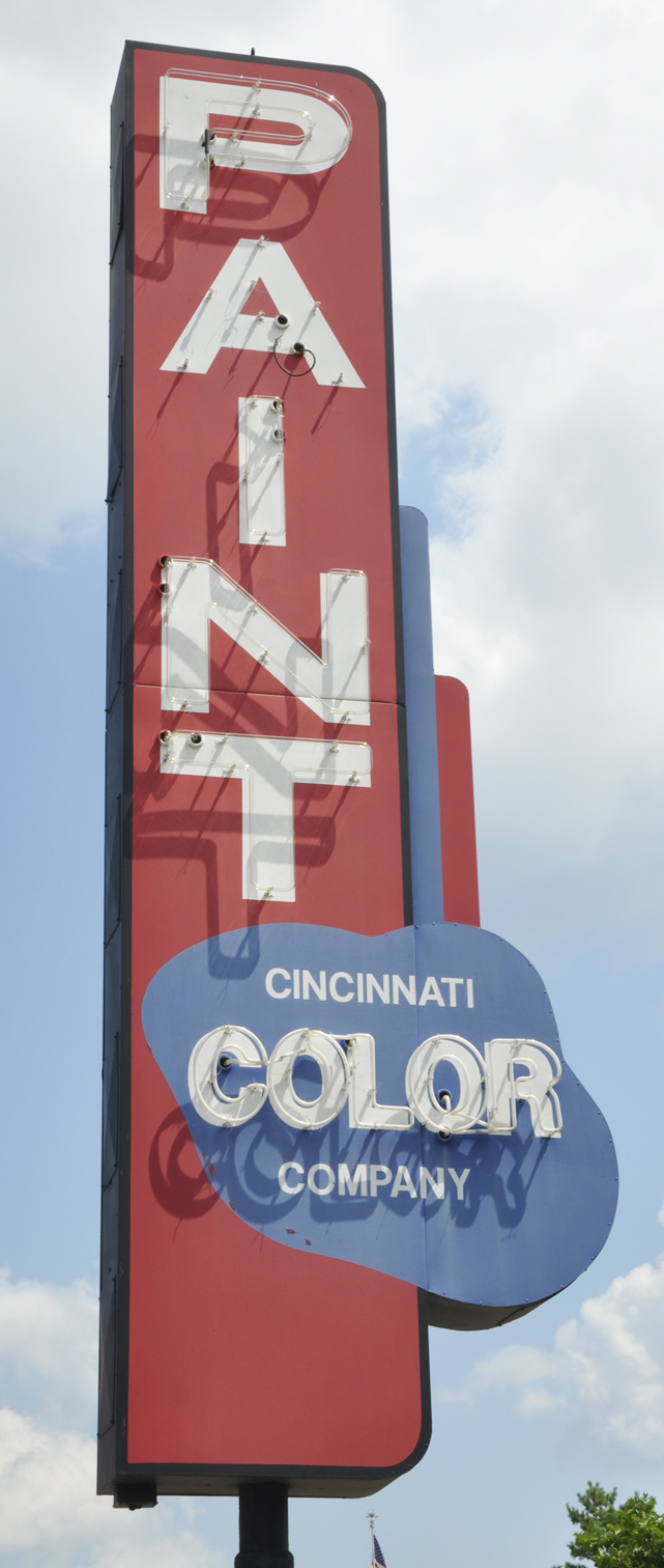 The Cincinnati Color Company was established in 1929. The first sign shown above is probably from the 1950s. By 2007, that store was closed and the sign's neon was gone. [map] The second Cincinnati Color Company sign appears to be modern, built in the style of the earlier sign. That store is still operating. [map] |