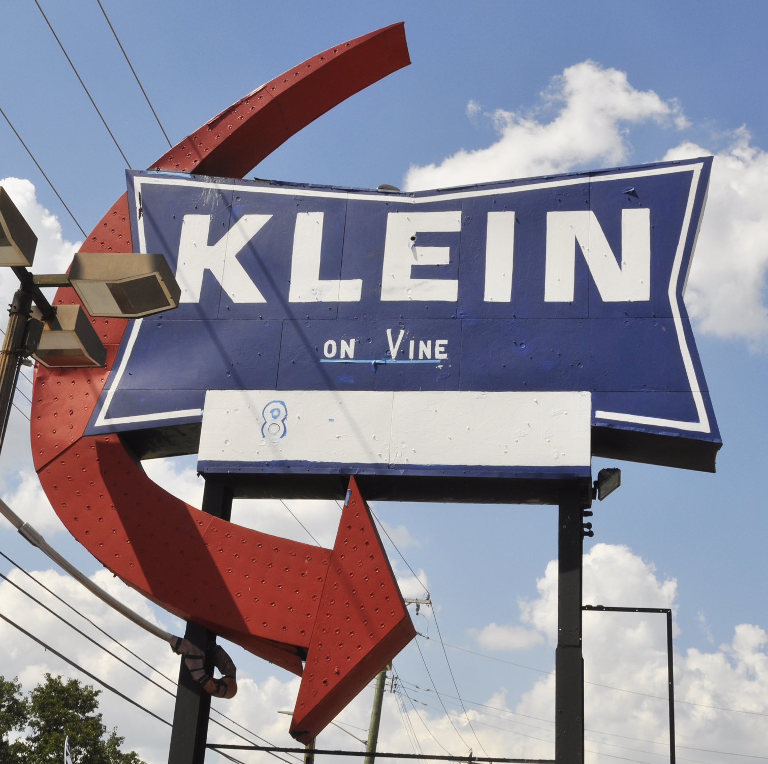 The Klein Motor Co. moved to this location around 1956 and this sign is probably from then. The business is now known as Klein on Vine which was an advertising slogan used by the previous business. The neon and bulbs were removed from the sign around 2005. For more, see this website. [map]