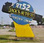The Jack's Used Auto Parts sign originally advertised for the Route 52 Flying Saucer Drive-in which had been built by the late 1950s. The property is now used by a car junkyard. The hamburger piece on the sign was painted over around 2020. [map]