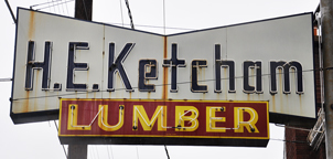 H.E. Ketchum Lumber was established in 1907 and moved to this location around 1920. When the owners moved again in 1985, this sign was left behind. This photo is from 2011. The sign was still there in 2012 but gone by 2016. |