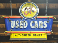 | Roy McGraw Used Cars has been around since 1954. This sign appears to be from then. By 2018, the sign's neon had been removed and the text panels had been painted black. It now advertises for Jose's Auto Sales. [map] |