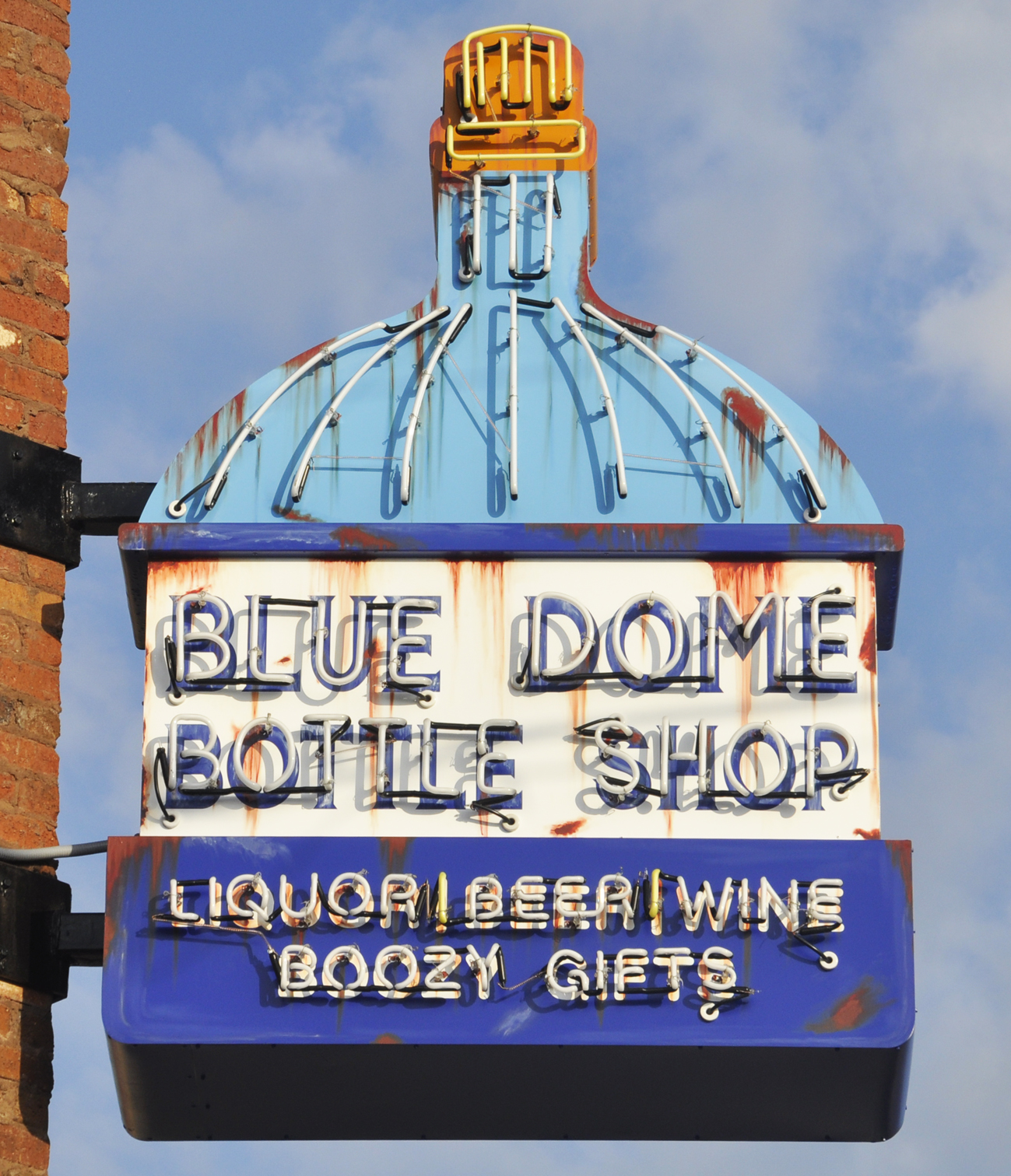 The Blue Dome Bottle Shop opened in 2025 and this sign with its simulated patina and dome-shaped bottle was built then. The store is next door to the Blue Dome Station. [map]