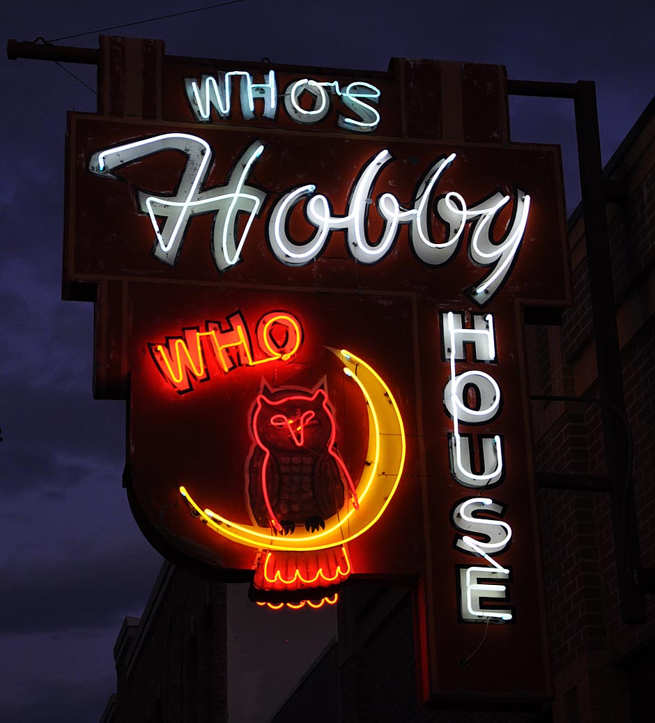 The Who's Hobby House opened in 1950. The name came from the original owner's initial (WHO). This sign was built in 1951. The store sells model kits, arts and craft supplies, trains, etc. [map]