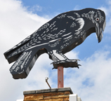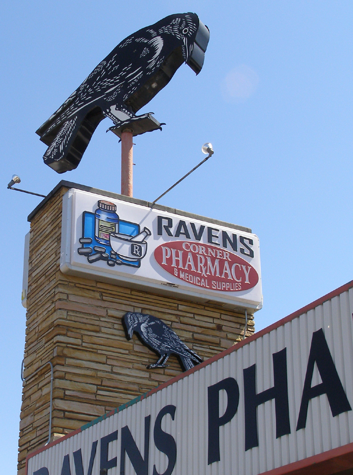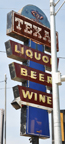 The Texas Liquor sign is probably from the 1950s. [map] The Womack Machine Supply Company sign is probably from the 1950s. It is covered with wire mesh to protect the neon from rock-throwing vandals. For more, see this website. [map] The Raven's Nest Pharmacy had been here since at least the 1960s. The giant raven sign used to revolve. The store was gone by 2015 but this sign remains. The building now houses a Cricket store but these signs remain. [map] |