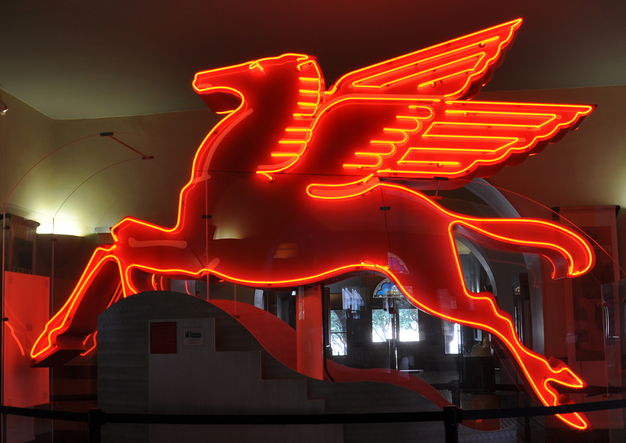In 2015, the original Pegasus sign was finally found in a shed. It was restored and is now displayed in front of the Omni Hotel on a simulated derrick support. [map] The Pegasus sign at the Old Red Museum was supposedly built in 1939 for the New York World's Fair. I haven't found any photos of that. The sign was later installed on the roof of Jim Smith's Mobil station in Dallas where it was lit and revolved. When the station was demolished in the early 2000s, the sign was saved and installed at its present location inside the museum. |