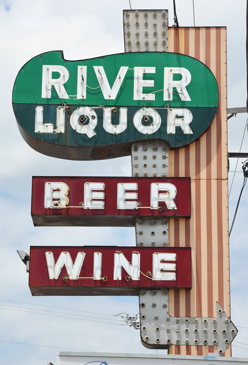 The River Liquor sign is probably from the 1950s. The building was demolished in 2024 but the sign remains. The sign is so similar in design to the one that was at Atomic Liquor that it's likely that these two stores were related. For more, see this website. [map]