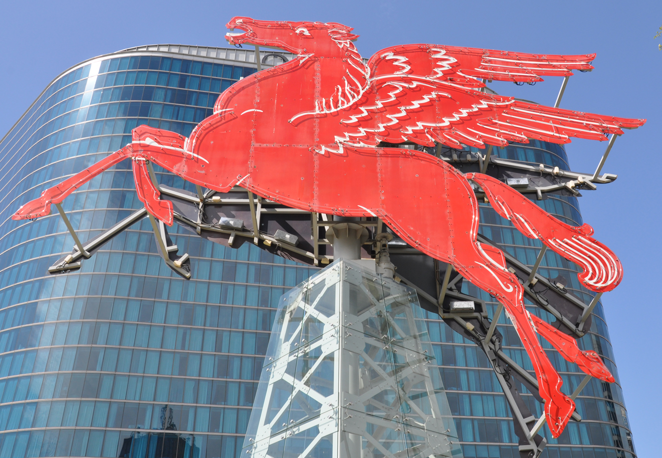 The Magnolia Building was built between 1921-1922 for the Magnolia Petroleum Company. In 1934, the company installed a neon sign with a depiction of a pegasus which was Magnolia's trademark. That sign was originally built for the American Petroleum Institute convention. The double-sided sign is 40 feet by 30 feet. It originally revolved on an oil derrick-like tower on top of the building. In 1976, the building was sold and the sign deteriorated. In 1997, the building was converted into a luxury hotel. A year later, the sign was removed for restoration. It was deemed too far gone and a replica was built and installed on the building in 2000. In 2013, that sign was restored again and relit. For more, see this website. [map]