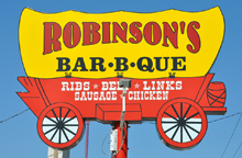 The College Cleaners sign appeared to be from the 1950s. It was removed in 2022. Robinson's Bar-B-Que opened in 1985. I don't know if this sign was built then or adapted from another business. The sign originally had neon. [map] |