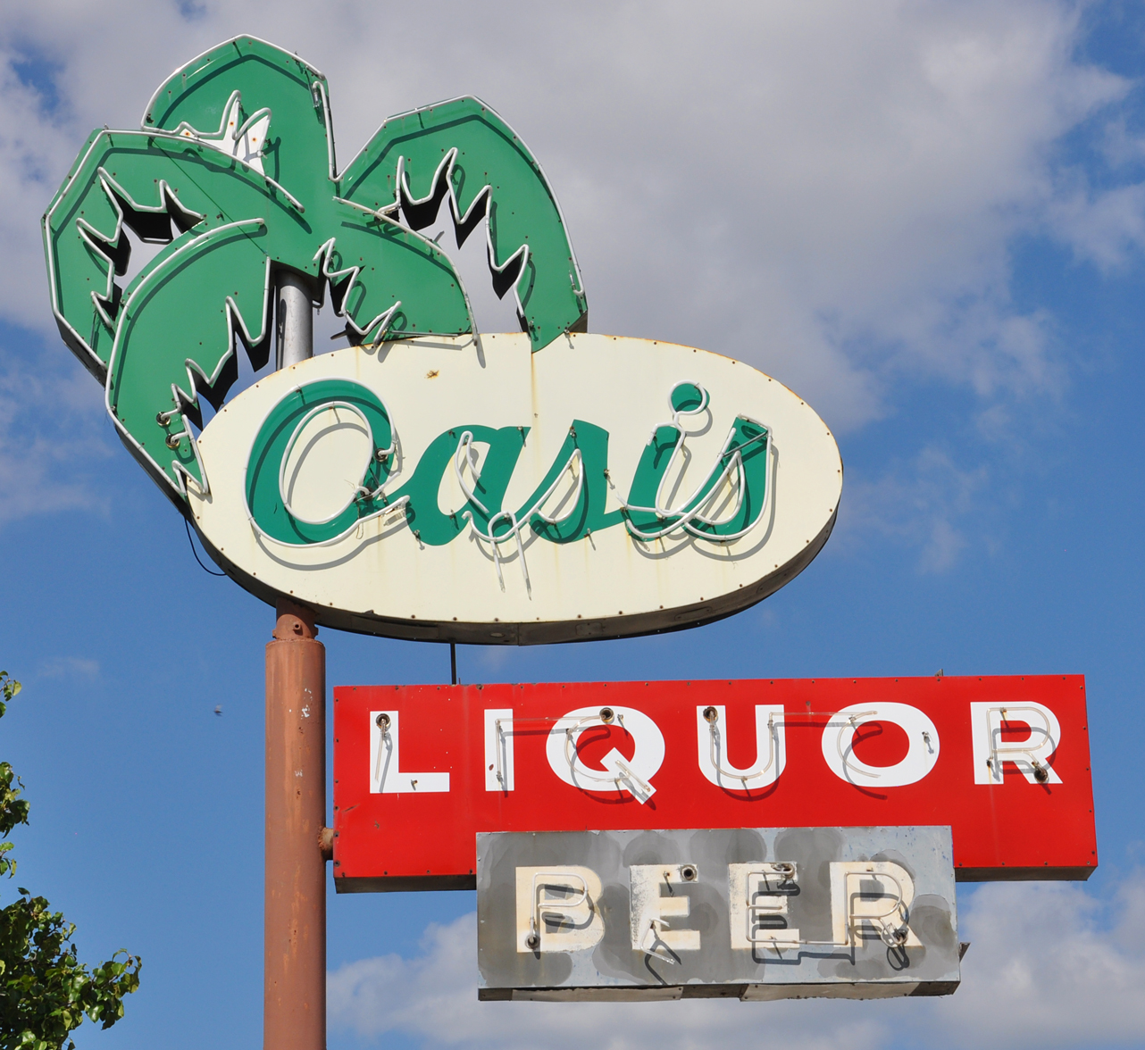 Oasis Liquor is now known as the J&G Oasis Beverage Center. This sign is probably from the 1950s or 1960s. [map]