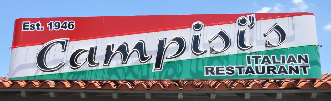 Campisi's Italian Restaurant was established in 1946. This location opened in 2013. This is probably a modern sign, rather than a reworked sign, with rounded edges meant to look older than it is. [map] |
