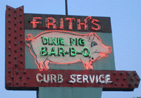 The Jumbo's Family Restaurant sign was advertising for Miss Annie's when this photo was taken in 2011. Before that, the restaurant went by the name of Aunt Bee's. Later, it reverted to the original name of Jumbo's. By 2013, the restaurant had closed and the sign was gone. For more, see this website. The Dixie Pig Barbecue sign is probably from the 1950s. For more, see this website. [first photo thanks Robby Delius] [map] |