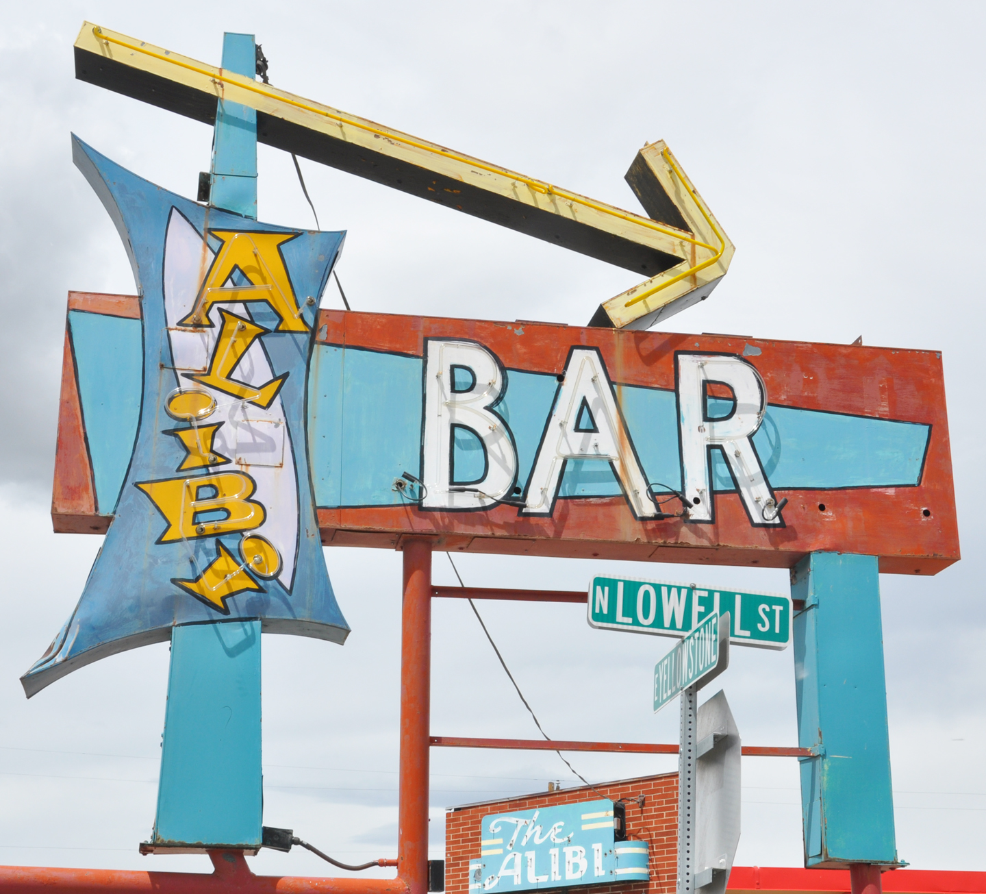 | The Alibi Bar & Lounge opened in 1956. The sign installed flat against the facade was probably a projecting or pole sign originally. The current pole sign might be from the 1960s. There was also a rooftop sign which was removed around 2020. [map] |