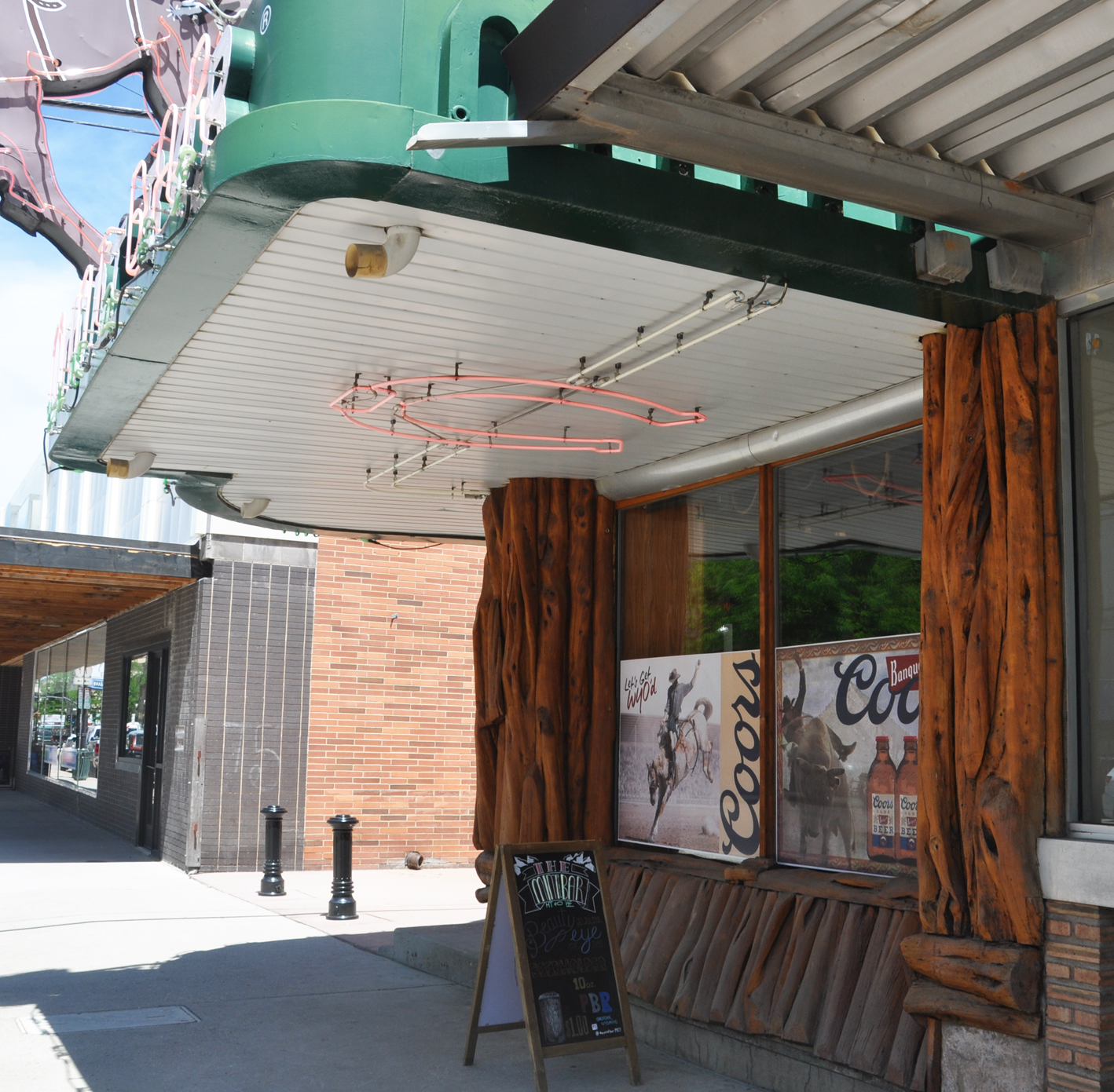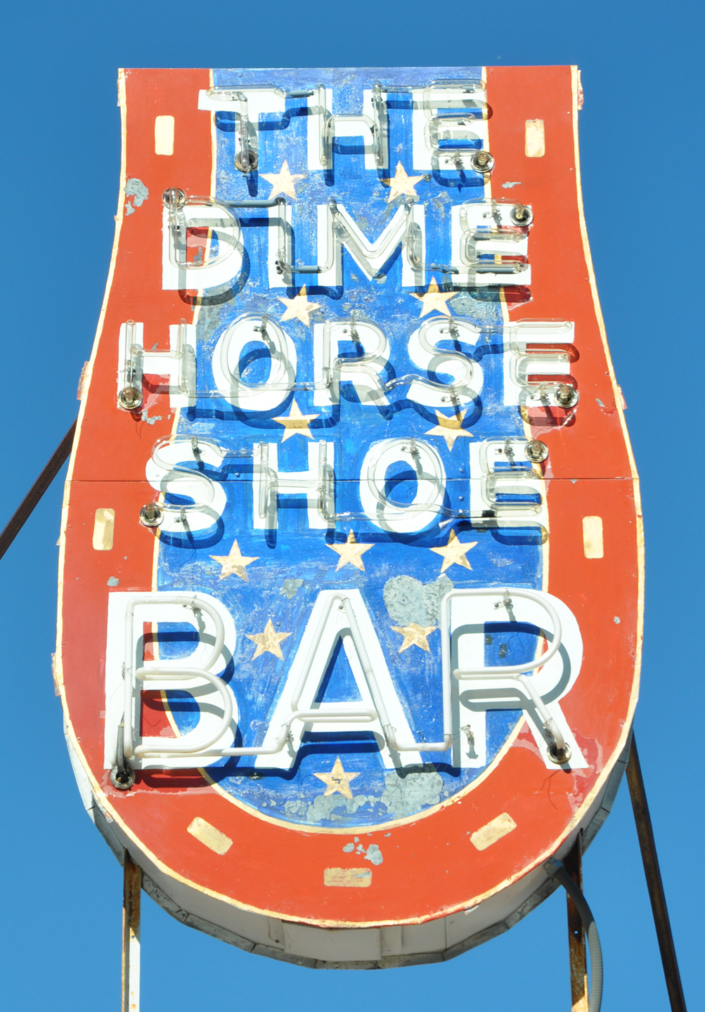 | The Mint Bar was established in 1907. This sign was built around 1947 when the bar was remodeled. It was produced by the Sheridan Sign Company and painted by Bernard P. Thomas. The horse and rider panels are about 12 feet tall. They were repainted around 2006. The neon cattle brands around the canopy were probably animated originally. For more, see this website. [map] |