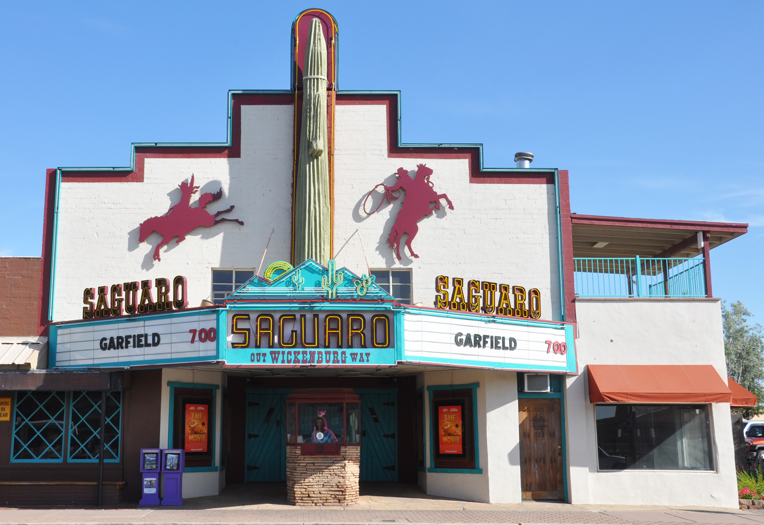 | The Saguaro Theatre opened in 1948. It was restored around 2006 and is still in operation with live entertainment and movies. Around 2020, new letters were added to the sign as well as cowboys and neon to the facade. For more, see this website. [map] |