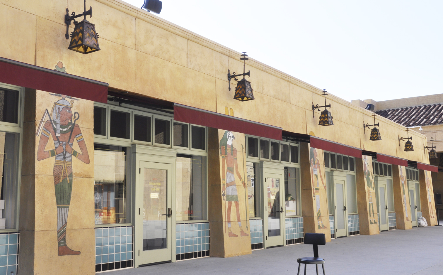 In the 1940s and 1950s, the courtyard was roofed over and the entrance was walled off. In 1970, the interior's stage and columns were removed in order to show wide-screen films. The theatre closed in 1992 and then, in 1994, it was badly damaged during the Northridge earthquake. The Egyptian reopened in 1998 after a $14 million renovation. The theatre closed again in 2020 and reopened in 2023 after a $70 million restoration for Netflix. The blade sign was painted red at that time. The sign was built in the 1990s as part of an American Cinematheque renovation. It was modeled after the original sign which may have been red originally. The scaffold sign American Cinematheque (third photo, top row) is gone now. For more, see these websites: 1 and 2. [map] |