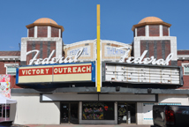 | The Federal Theatre opened in the 1920s. It was remodeled in 1948 and this marquee is apparently from then. The theatre closed in the 1970s. The building housed a church for many years but has been vacant since then. In 2025, it was announced that the building would be developed as a music venue. For more, see this website. [map] |
