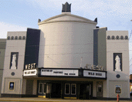 | The West Theatre opened in 1941. It was renovated in the late 1970s to its original appearance. Although the theatre was twinned in 1986, the original screen is still there behind the two newer screens. The building is listed on the National Register of Historic Places. By 2013, the building had been repainted blue and gold. By 2015, it was painted green. For more, see these websites: 1 and 2. [map] |