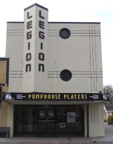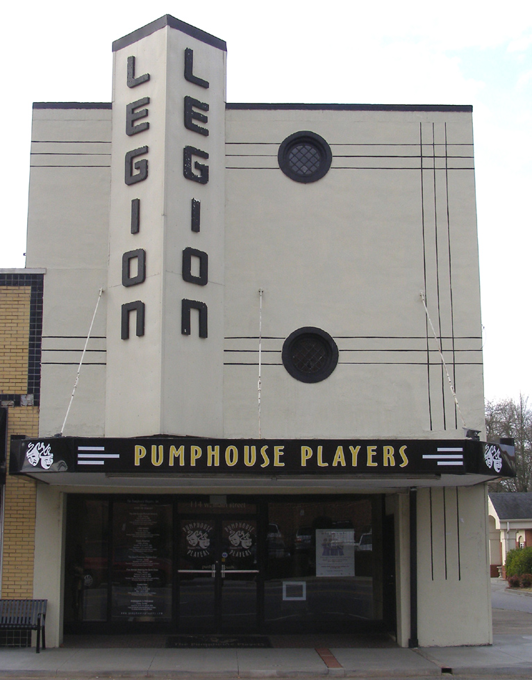 | The Legion Theatre was built in 1940. The theatre was originally white with brown trim and a metal marquee. The building is now used for live performances by the Pump House Players. The vertical letters must have had neon originally. They were replaced by 2015 with plastic letters. For more, see this website. [map] |