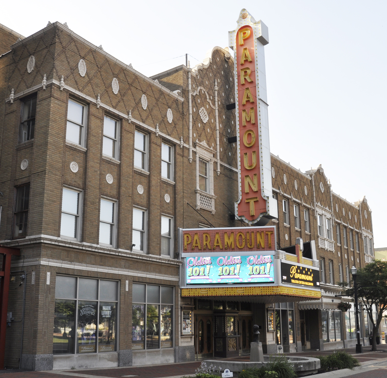 | The Paramount Theatre opened in 1929 and closed in 1985. It was nearly demolished in 1989. It was restored and reopened in 1995. The replica vertical sign was created around 2008. In 2024, the readerboards on the marquee were replaced with digital displays. The theatre is now used for live performances, movies, and private events. For more, see these websites: 1, 2, and 3. [map] |