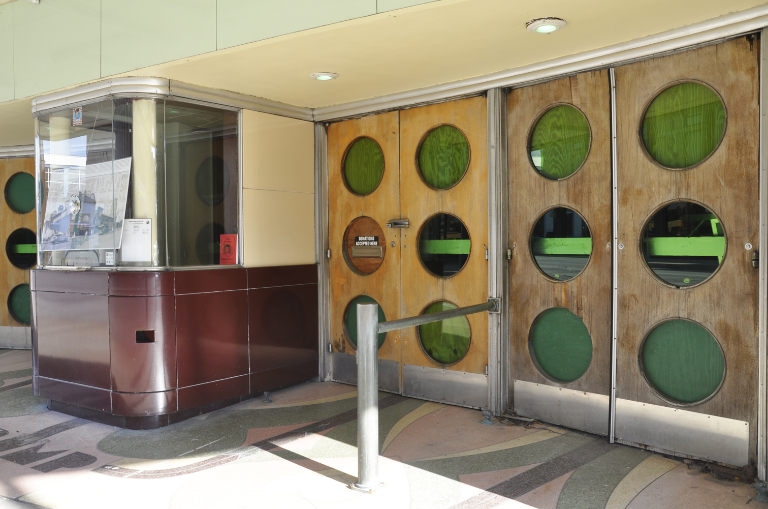 | The State Theatre was built in 1940 and closed around 1979. It was then occupied by a church. In 2008, it was adapted for restaurant use. It now houses the Five Star Dive Bar. For more, see this website. [map] |