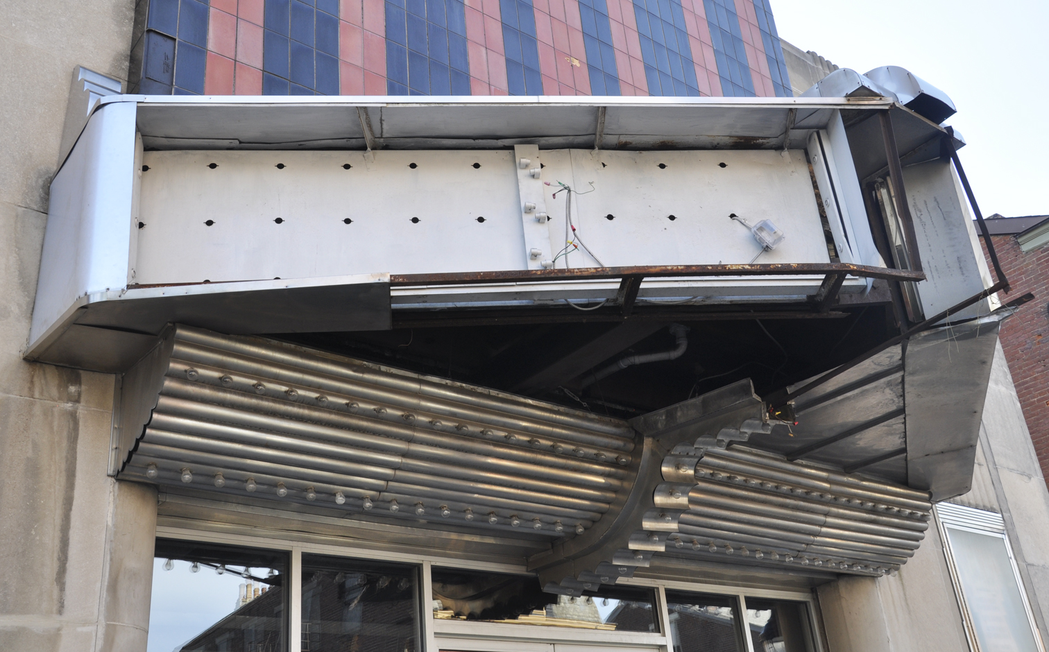 The sign was produced by Federal Electric. Each letter is a separate modular unit and is illuminated with bulbs. What makes this sign unique is its red letter panels. Federal Electric advertising from the early 1920s makes no mention of anything but royal blue sign panels with white letters. It recommended this color combination to customers as providing the greatest contrast and readability. By the mid-1920s, the company began producing sign panels in green and a splattered mix of blue and green ("mottled blue-green"). However, there is no evidence that Federal Electric produced sectional signs in these colors. Therefore, the red panels of the Plaza Theatre sign were either custom ordered or, more likely, an example of a rare, later option. The Plaza Theatre sign letters are lit white with static, clear bulbs. The bulbs in the starburst pattern at the top of the sign are lit sequentially from the inside to the outside of the sign panels. Those bulbs have red and yellow covers which add color to the sign at night. For more, see these websites: 1 and 2. [map] |