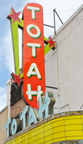 | The Luna Theatre opened in 1916 as the Mission Theatre. The name was changed to the Luna in 1935. This marquee was added then. The neon moon's left eye winks on and off. For more, see these websites: 1, 2, 3, and 4. [map] |