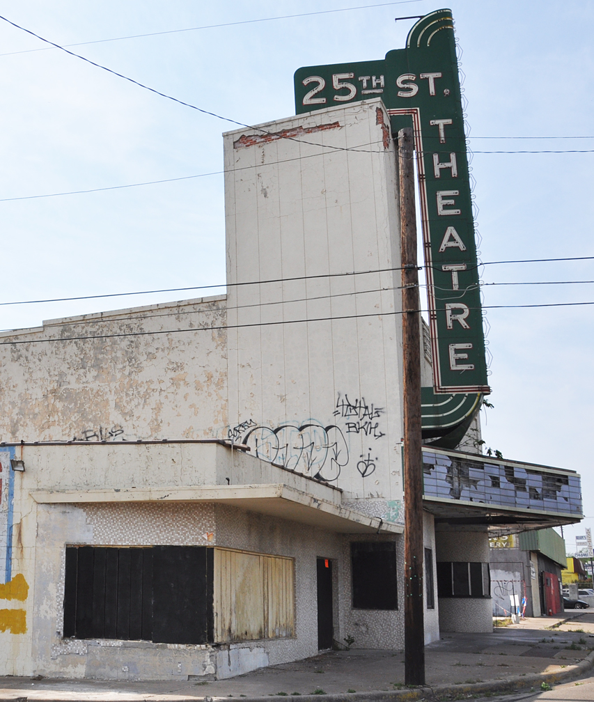 | The 25th Street Theatre opened in 1945 and closed in 1982. It reopened in 1986 as a nightclub. The theatre has been vacant since 1992. In 2019, the sign was removed and put in storage because of concerns for its stability. The building was demolished and a new building of similar design was built for the fire station. A replica of the sign was installed which reads 25th St. Station. For more, see this website. [map] |