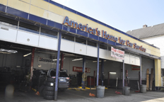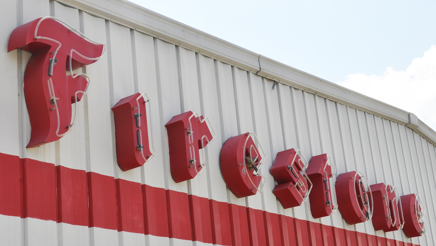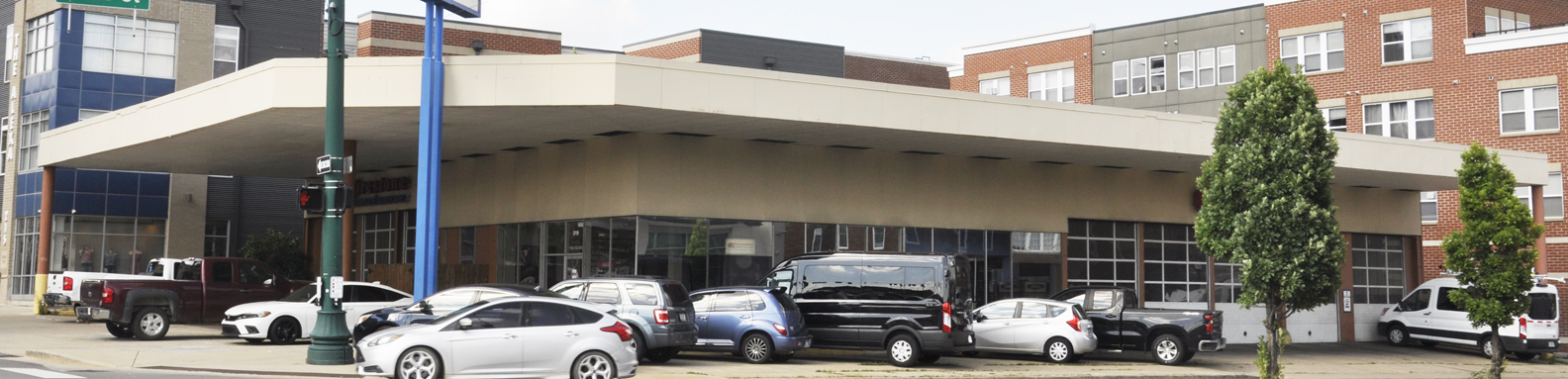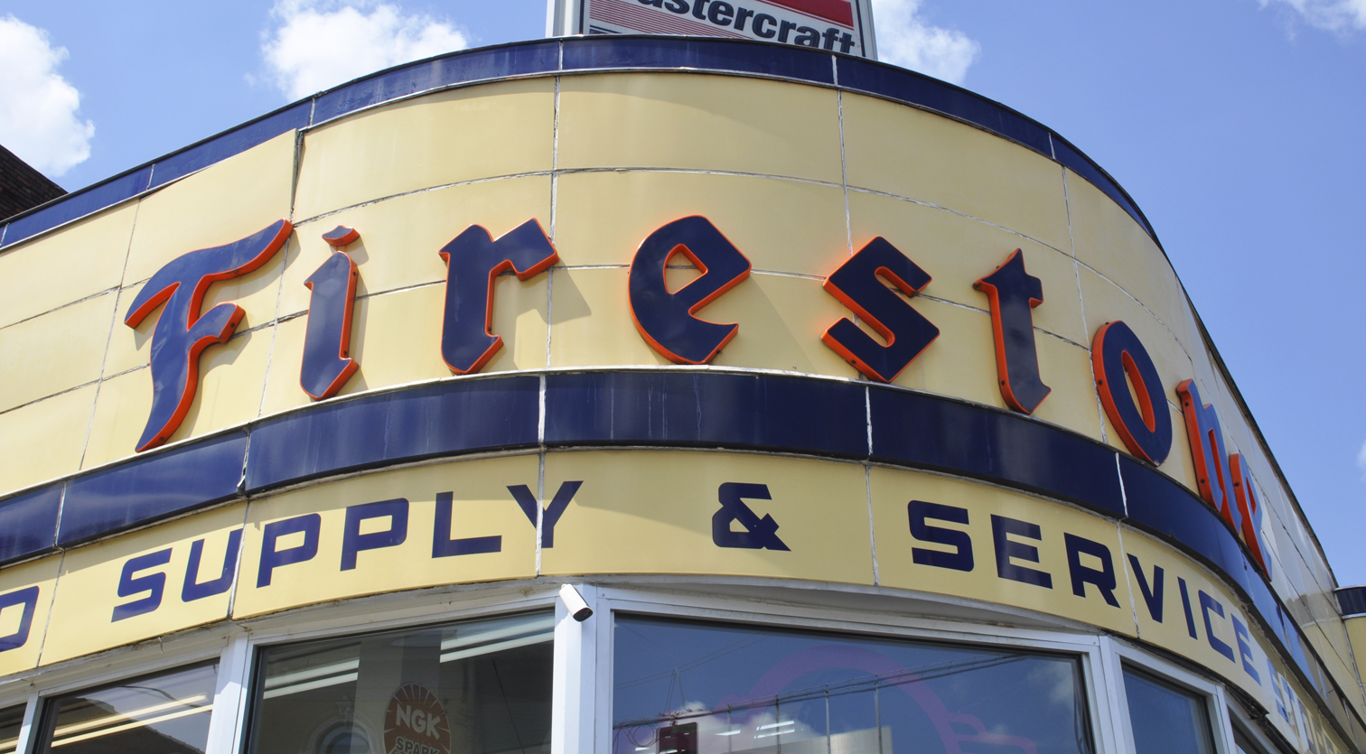 | This Firestone store was built in 1938. I have never seen another surviving Firestone building like this. In the 1970s, the Firestone letters were painted red and the building was painted white. At some point, the paint was removed revealing the building's original cream-colored porcelain enamel panels and the letters' earlier navy and orange colors. When the store originally opened, it sold appliances, bikes, radios, and gas in addition to tires. The store is now known as Mike Smith's Firestone. [map] |