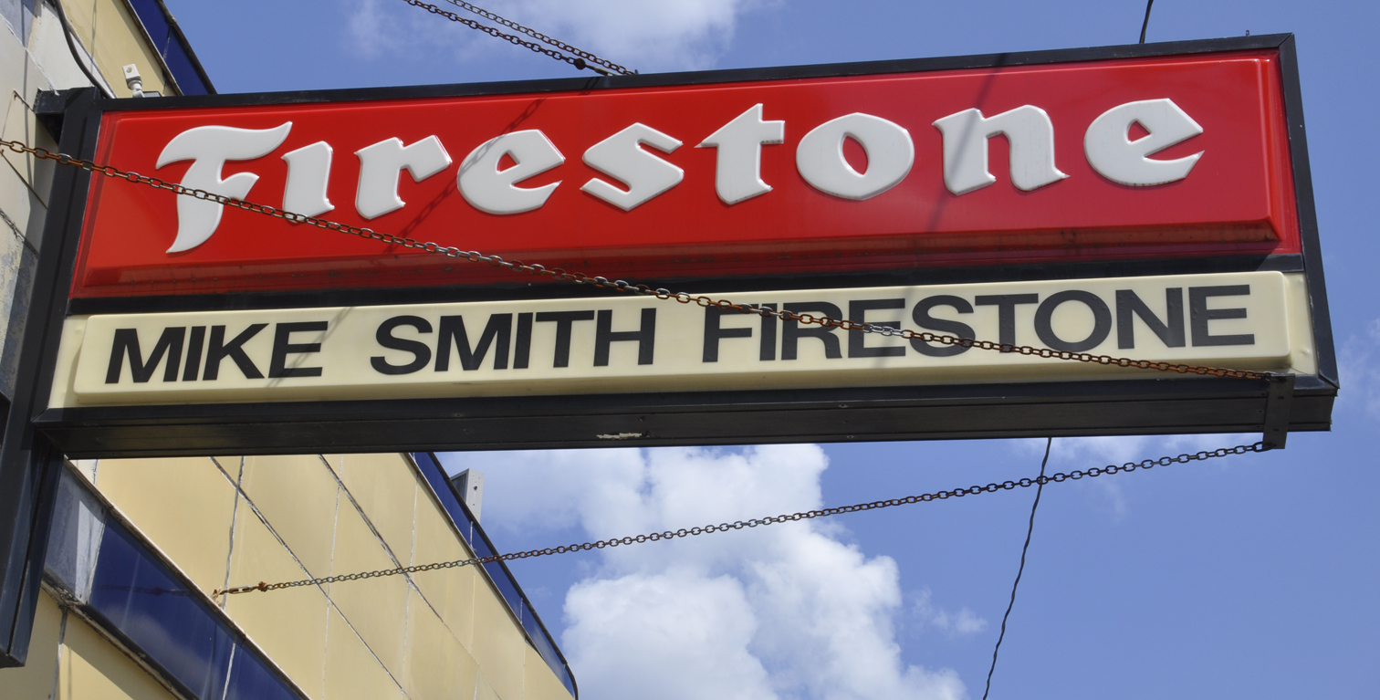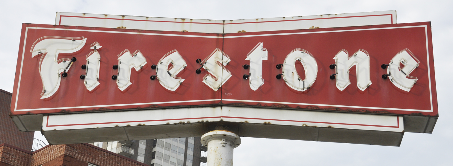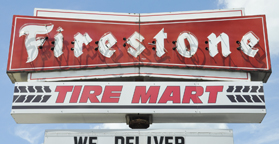 | This Firestone store has been at this location since at least 1932. This sign is probably from the 1950s. [map] |