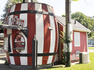 | The Cider Barrel was built in 1922 as a roadside stand that sold locally produced cider and other produce. The barrel is 12 feet tall. The stand closed in 2003 and the trailer park behind it, the Cider Barrel Mobile Home Court, was razed. In 2004-2005, the Barrel was restored and repainted while an apartment complex was built behind it. By 2007 (bottom row of photos), a sign was installed next to the barrel. In 2012, the property owner expressed the desire to have the stand moved somewhere else. However, the Cider Barrel is still there. [map] |