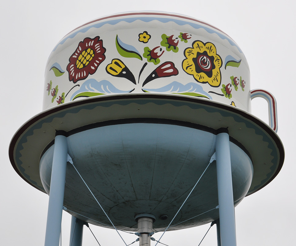 The Coffee Pot Water Tower in Stanton was built in 1921 as a normal looking water tower. In 1971, it was transformed into a coffee pot as a tribute to Virginia Christine who portrayed Mrs. Olson in Folger's Coffee TV commercials. The water tower is 120 feet tall. The coffee pot itself is 35 feet tall. In 2015, the Coffee Pot Water Tower was taken down. The Coffee Pot is now on display just a few feet off the ground at the Swedish Heritage & Cultural Center in Stanton. For more, see these websites: 1 and 2. Stanton's Coffee Cup Water Tower was built in 2000 and is 96 feet tall. When the Coffee Pot Water Tower ceased functioning, the Coffee Cup Water Tower was built to complement it. The Coffee Cup Water Tower is still in operation. These photos are from 2008. [coffee cup map] |