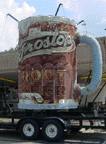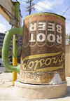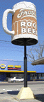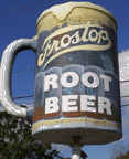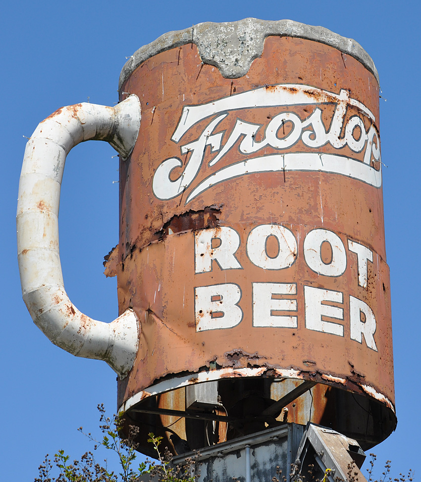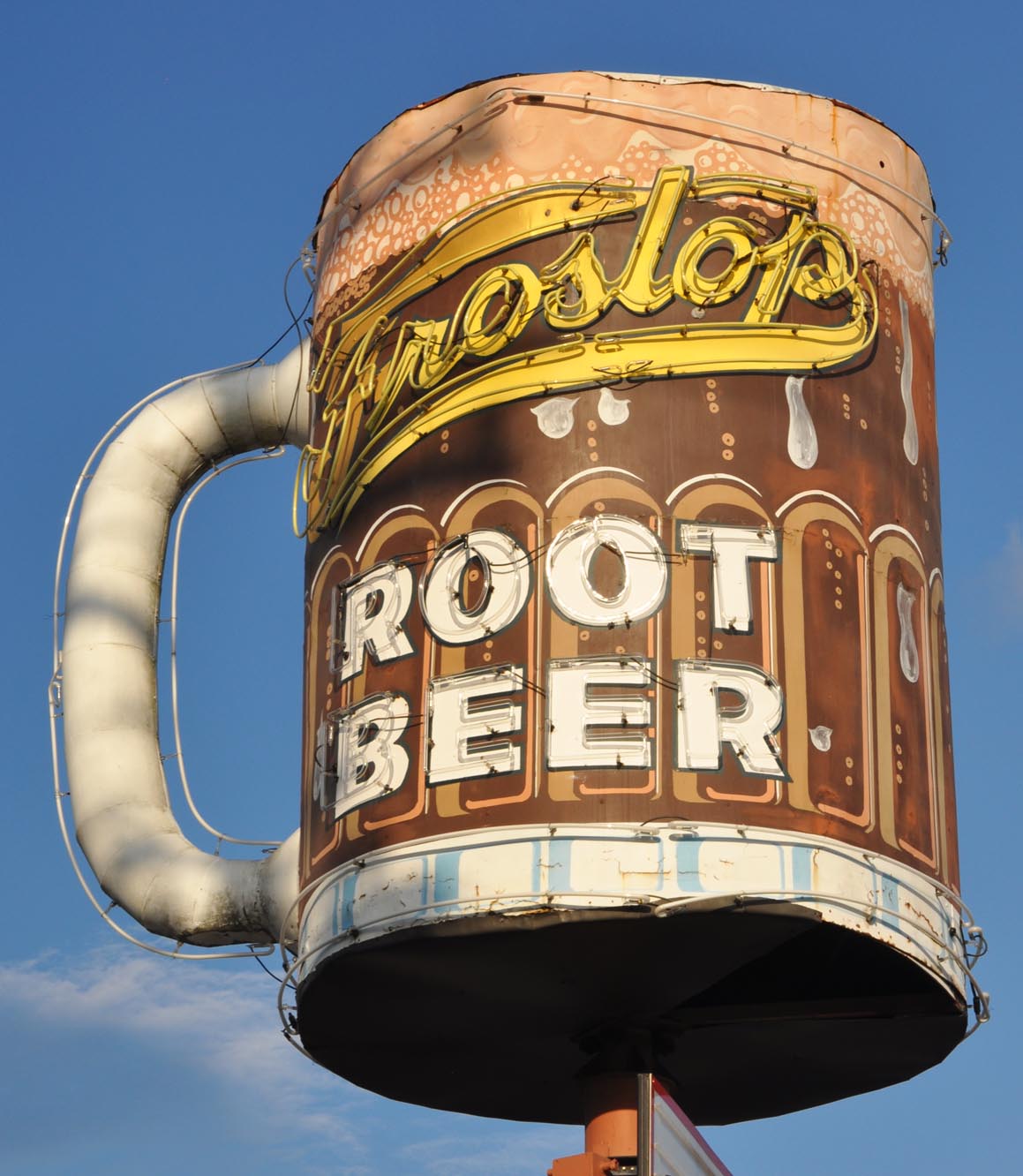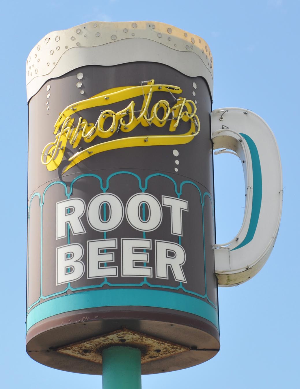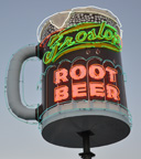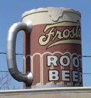 This Frostop opened in 1958. The mug was originally installed on the roof. It was moved to a pole sometime in the 1960s. Neon was added to the mug and the building at that point. A dining room was added in 1962. The mug was first restored in 1987. A complete restoration took place in 2007. The mug was removed (third photo top row) and completely rebuilt for nearly $20,000. The barrel of the mug was replaced with rust-proof aluminum and painted like the original. The handle and foam piece from the old mug were used. The revolving mug is lit at night when the restaurant is open.