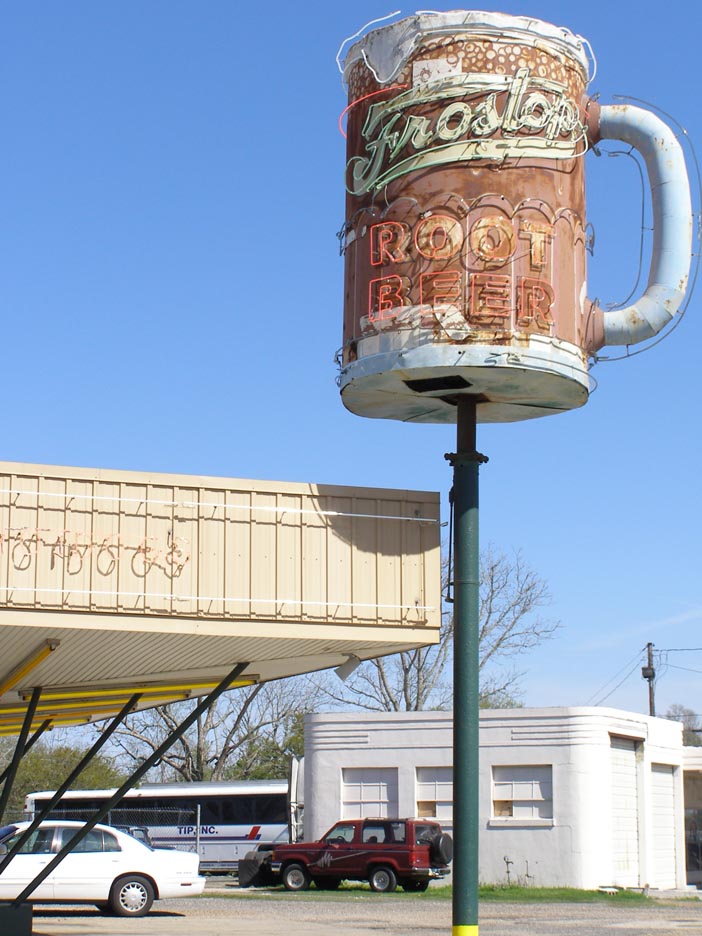 The Frostop in Raceland featured a pole sign mug with missing neon. This photo is from 2006. The store has since closed and the mug is gone.