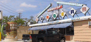 Ted's Frostop opened in 1955. Ted Sternberg owned several Frostops in New Orleans as well as three stands in Little Rock. This mug was originally installed on a pole (see top photo) and did not have neon. The building's rooftop signage was not damaged during Hurricane Katrina in 2005. However, the mug was knocked off the pole and found upside-down. The owner decided to move mug back a bit, install it upside-down on a base and use it as the location's logo. In 2007, the mug was restored - still in the upside down position. In 2011, a new owner had the mug restored, fixing a crunched corner from Katrina. It was returned it to the pole in the upright position. Neon was added and the mug is spinning again. Although the mug had not had neon for many years, there were holes indicating that it had been there at one time. For more, see these websites: 1, 2, 3, and 4. [1998 photo thanks Rich Kummerlowe] [map]