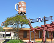Maintaining these neon mugs isn't cheap. This location has a $1,200 per year contract to keep the neon and rotation working properly. Their building was remodeled in 1981 and 1996. The original brown and cream tile was replaced with wood, siding, and now has cream tile. Their root beer is still homemade and served in frozen mugs. A vintage Frostop barrel is on display in the dining room. In 2021, the mug was knocked off the pole during Hurricane Ida. It was restored and reinstalled in 2022. For more, see these websites: 1, 2, 3, and 4. [top row right photo, second row right photo thanks Terry Toler] [map]